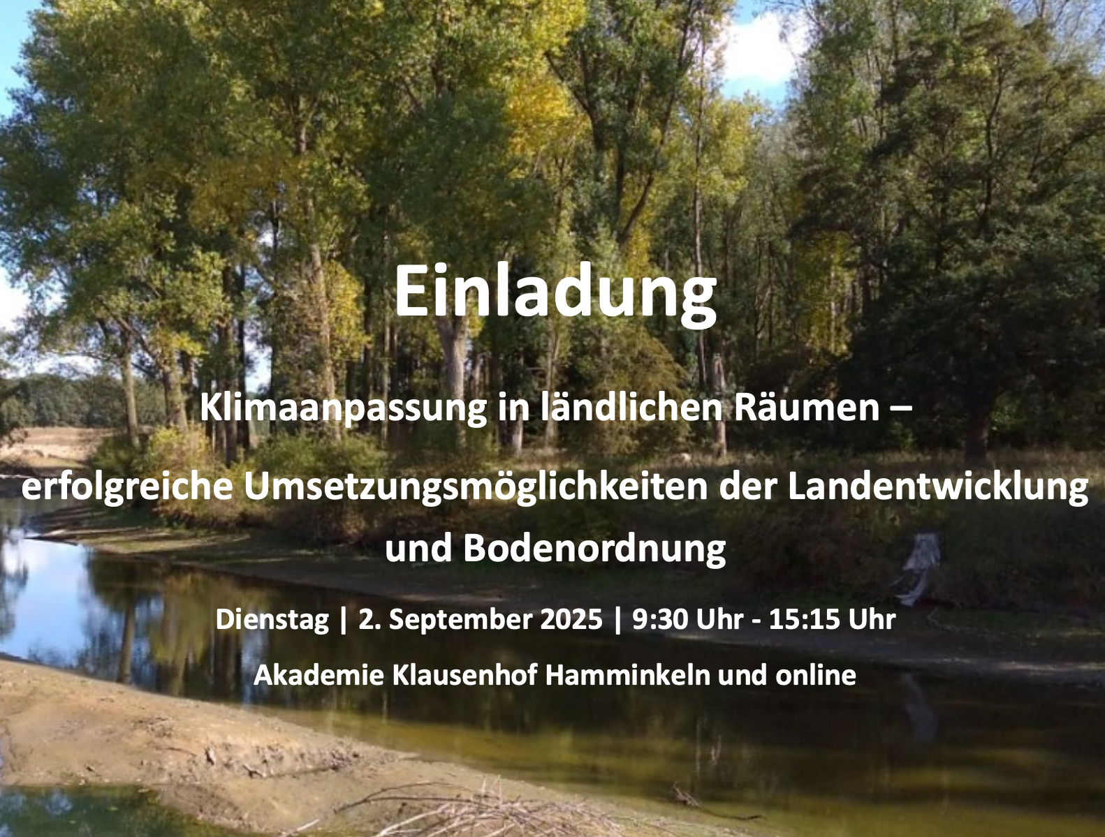 Die Veranstaltung rückt die Bedeutung der ländlichen Räume für die Anpassungen an vielfältigen Folgen des Klimawandels in den Mittelpunkt. Mit der Regional- und Dorfentwicklung sowie der Bodenordnung stehen der ländlichen Entwicklung Instrumentarien zur Verfügung, die erfolgreich für die Umsetzung von Maßnahmen zur Klimafolgenanpassung eingesetzt werden können. Anhand verschiedener Vorträge werden diese Instrumentarien, der strategische Ansatz und Best-Practice Beispiele des Landes Nordrhein-Westfalen zur Anpassung an die Folgen des Klimawandels vorgestellt. Die Veranstaltung findet von 9:30 bis 15:15 Uhr statt und kann sowohl vor Ort in der Akademie Klausenhof Hamminkeln als auch online über Zoom verfolgt werden.