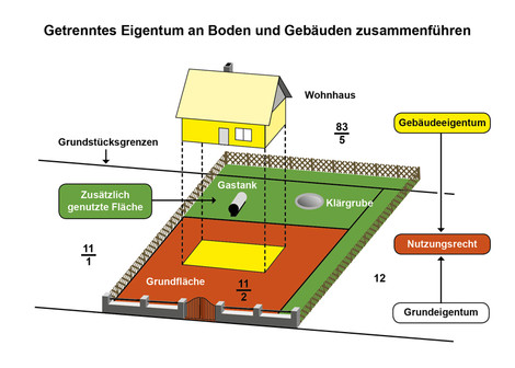 Die Skizze erläutert die Problematik, die durch das Auseinanderfallen von Grundeigentum, Nutzungsrecht und Gebäudeeigentum entstanden ist.